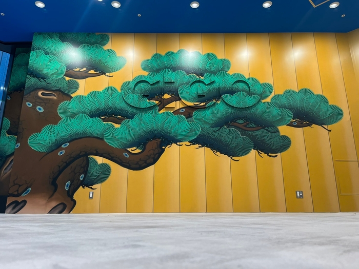コンセプトを空間デザインでも具現化するために、創業130年の『金井大道具』が手掛ける歌舞伎の舞台美術「松羽目※」を『CHIKIRI PROJECT』が2階の壁面に原寸大で再現。普段は近くで見ることのできない筆の質感まで伝わる再現性で、その前に立った瞬間誰もが主人公になれる空間を作り出しています。
