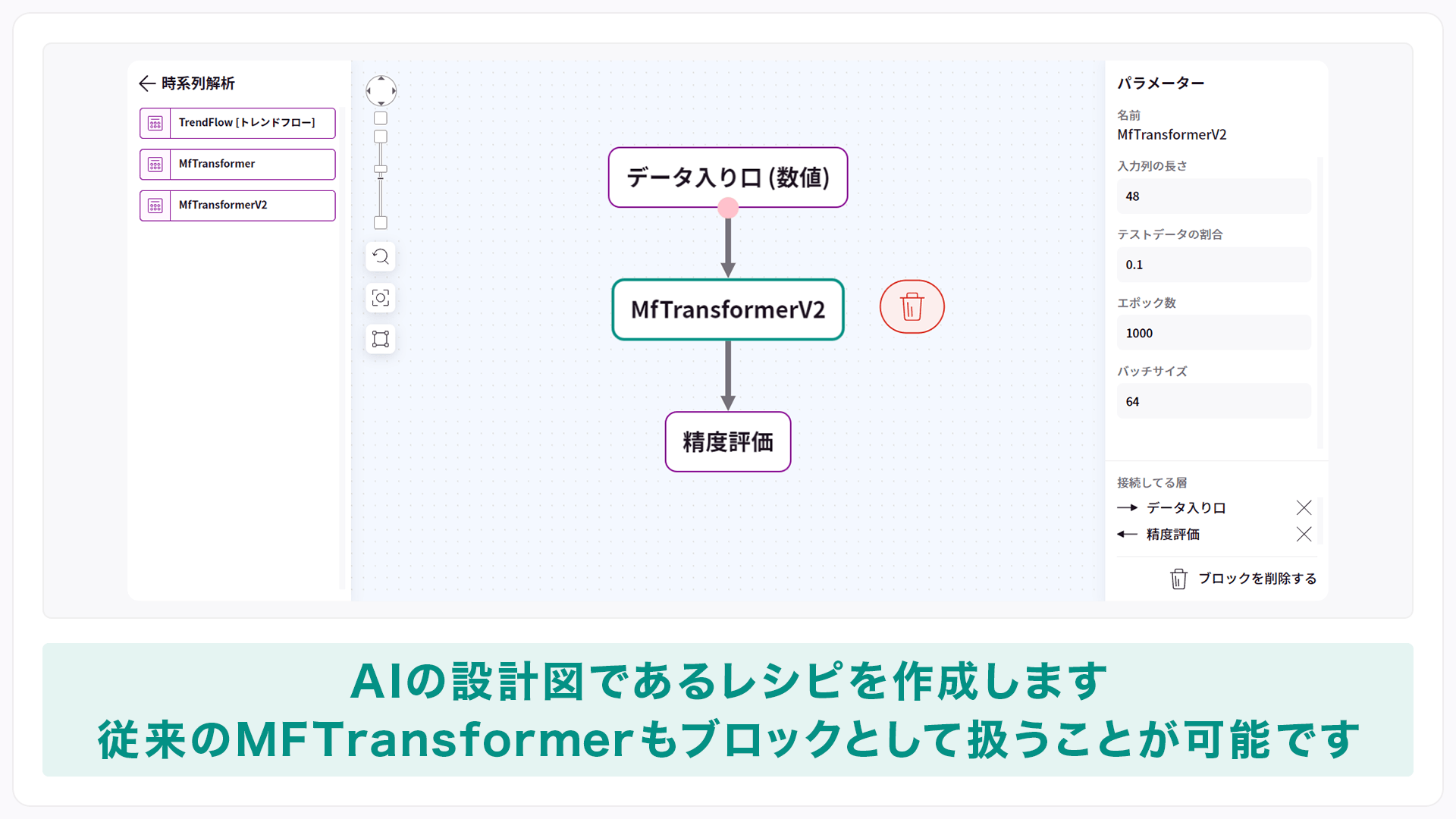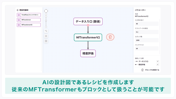 AIの設計図であるレシピを作成します。MFTransformer V2はもちろん、従来のMFTransformer もブロックとして扱うことが可能です。