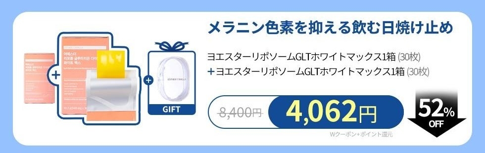 リポソームGLTホワイトマックスは美白の主要成分である高純度グルタチオンに強力な吸収率をほこるリポソーム工法を適用したODF口腔溶解フィルムです。メラニン色素の生成を抑制し、肌の明るさ、くすみの改善を手助けします。今回は1個+1個セットと大変お得に購入が可能です。さらに、先着500名様に限り、限定エスターフォーミュラポーチも無料贈呈いたします。内から輝くCGのような白玉肌を!この機会にぜひお得にお試しください。