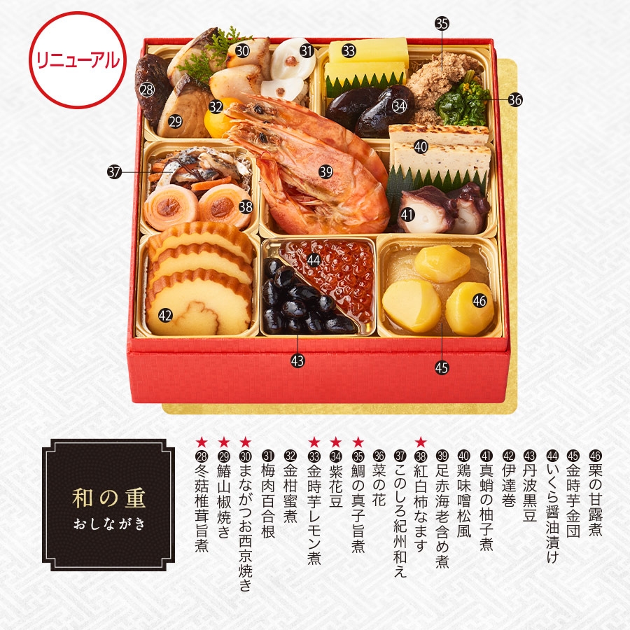 ★㉘ 冬菇椎茸旨煮 ★㉙ 鰆山椒焼き ★㉚ まながつお西京焼き ㉛ 梅肉百合根 ㉜ 金柑蜜煮 ★㉝ 金時芋レモン煮 ★㉞ 紫花豆 ★㉟ 鯛の真子旨煮 ㊱ 菜の花 ㊲ このしろ紀州和え ★㊳ 紅白柿なます ㊴ 足赤海老含め煮 ㊵ 鶏味噌松風 ㊶ 真蛸の柚子煮 ㊷ 伊達巻 ㊸ 丹波黒豆 ㊹ いくら醤油漬け ㊺ 金時芋金団 ㊻ 栗の甘露煮
