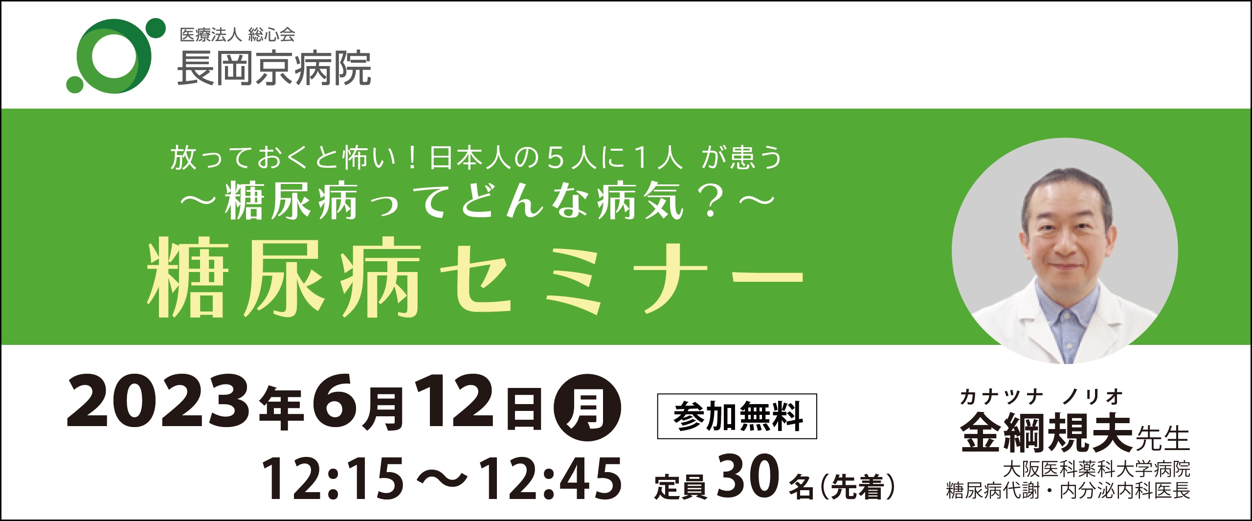 株式会社セントラルメディエンス(本社:神奈川県横浜市、代表取締役:中川隆太郎、以下「当社」)のグループ傘下である、医療法人総心会 長岡京病院 (所在地:京都府長岡京市、理事長:水黒知行、以下「長岡京病院」)は、6月12日に糖尿病セミナーを開催することとなりましたのでお知らせいたします。