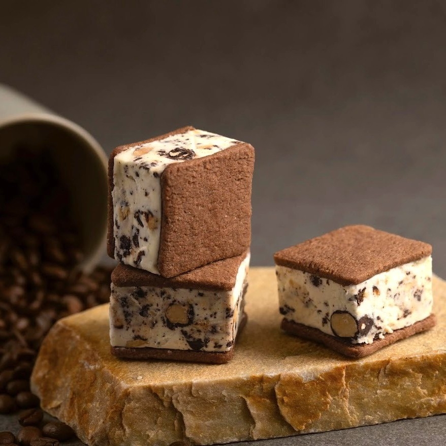 ホワイトチョコレートとクリームチーズを合わせた濃厚なバターサンド。スペシャルティコーヒー専門店のコーヒーチョコレートとヘーゼルナッツを加え、ほろ苦さや食感もお楽しみいただける一品です。