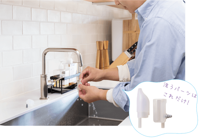 先端の鼻水タンクに鼻水が溜まるので、お手入れが面倒なチューブのお手入れは不要。洗うパーツが少なく、食器洗い乾燥機も使えてお手入れカンタンです。