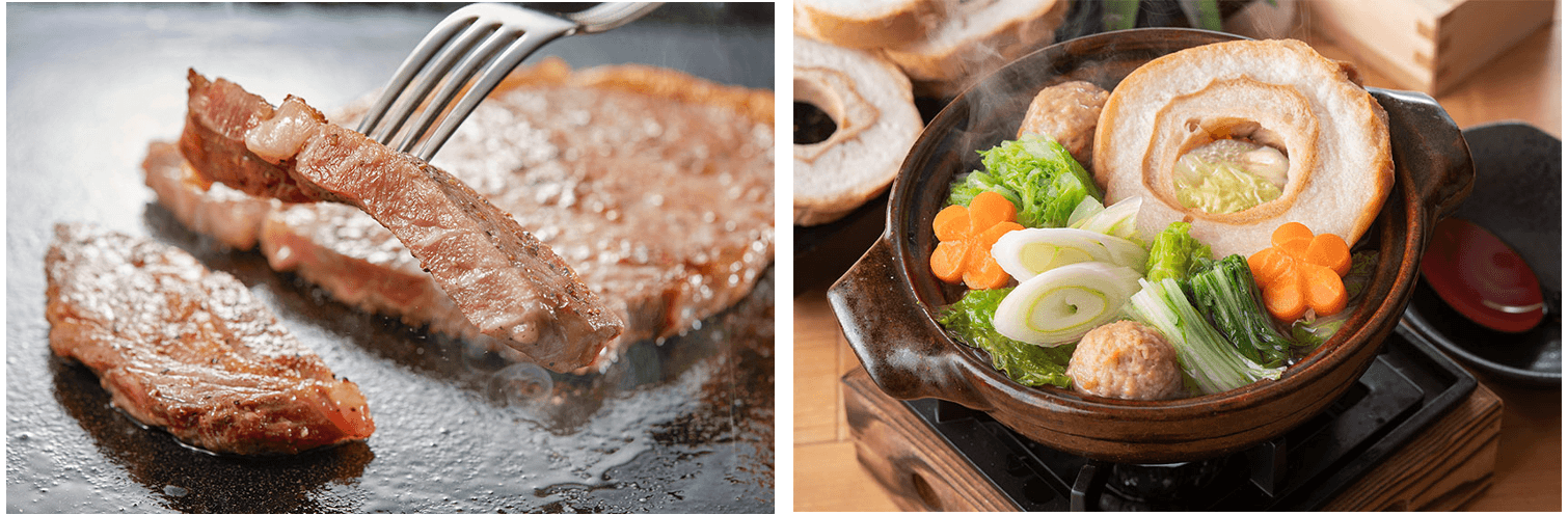 周辺観光でたっぷりと遊んだ後は温泉で汗を流してさっぱり。ペコペコのお腹でながやま自慢のグルメバイキングをお楽しみください。