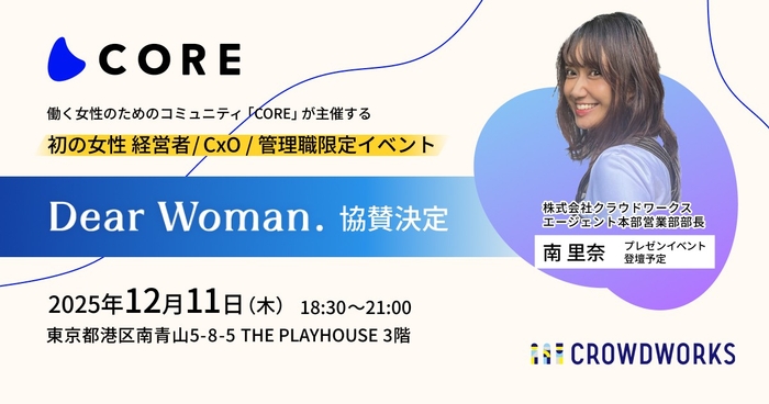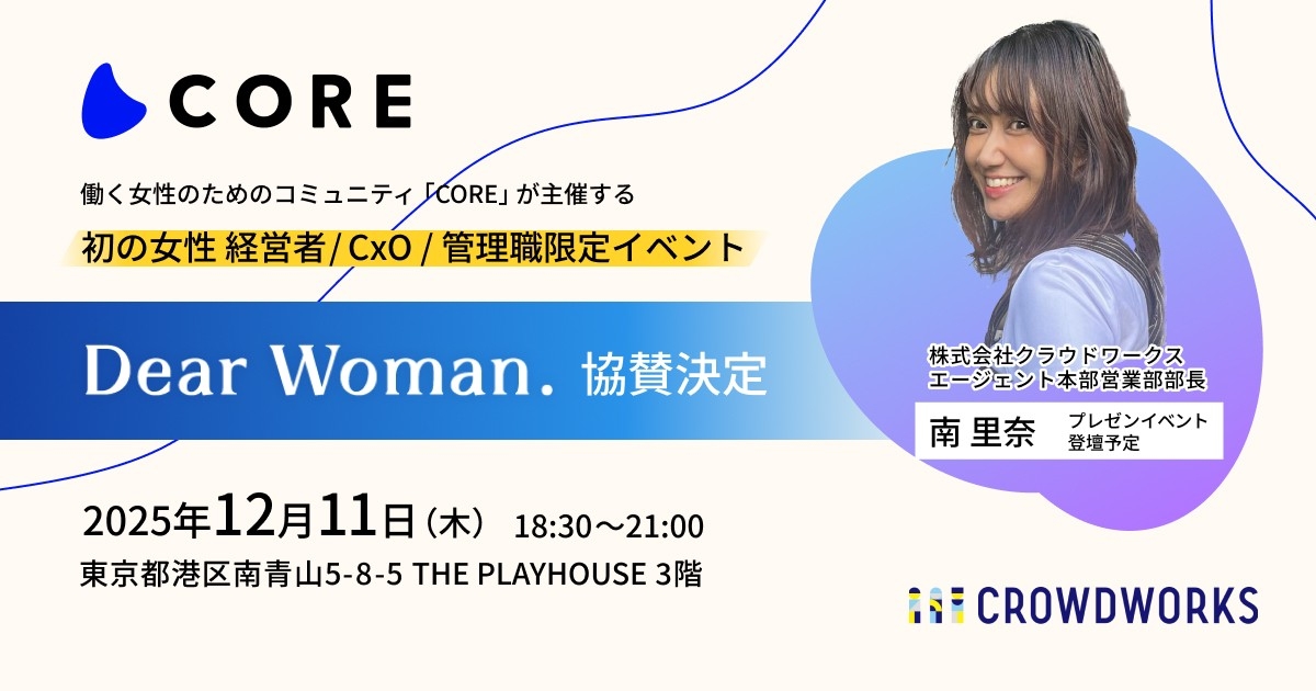 フリーランス業界最大級プラットフォーム(登録ワーカー含む登録ユーザー数700万人・登録企業100万社)を基盤に、IT人材&DXコンサルティングサービスを提供する株式会社クラウドワークス(本社:東京都港区、代表取締役社長 兼 CEO:吉田 浩一郎 以下「当社」)が運営する、即戦力IT人材のダイレクトマッチングサービス「テックダイレクト」は、2025年12月11日(木)に開催された、働く女性のためのコミュニティ「CORE」主催の企画「Dear Woman.」に協賛し、クラウドワークス エージェント本部 営業1部 部長 兼 テックダイレクト事業責任者の南 里奈が登壇しました。