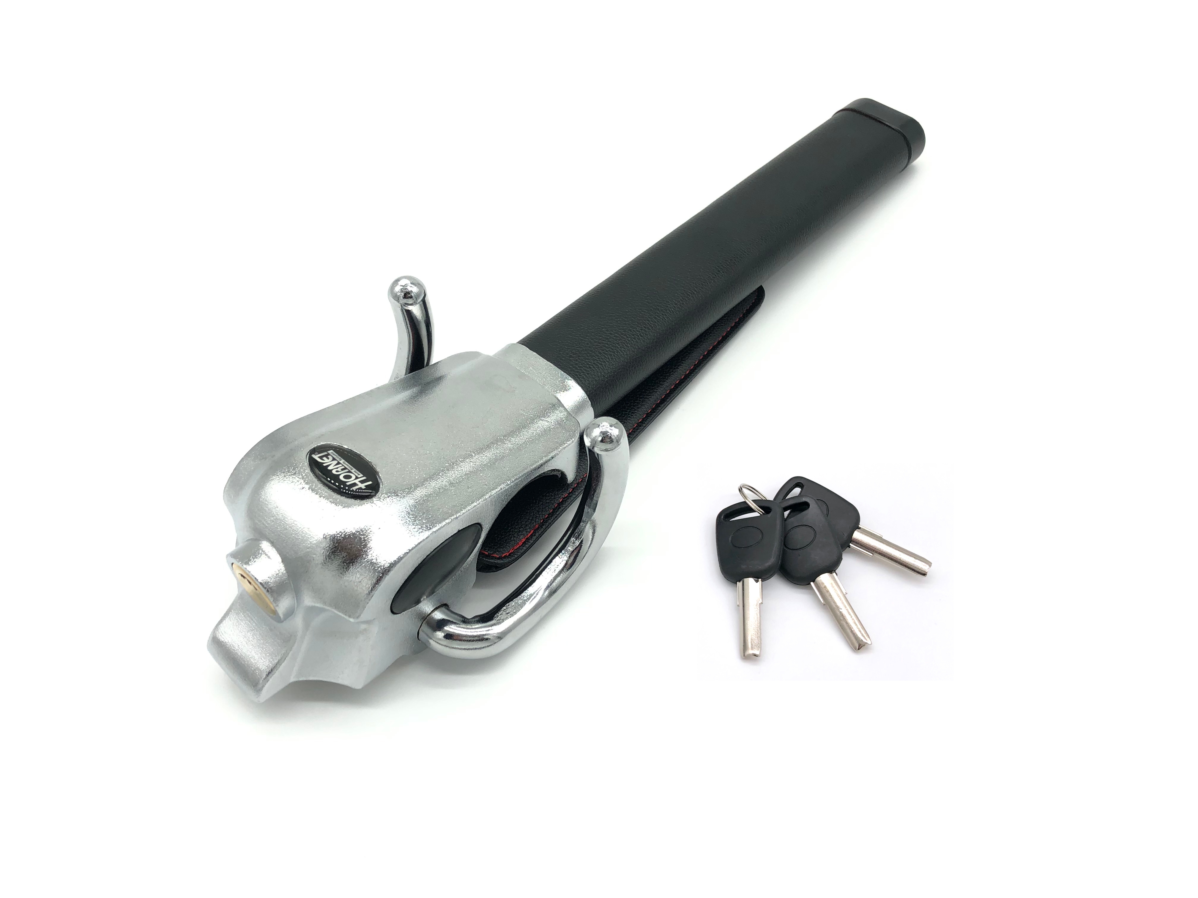 HORNETハンドルロックLH-5LBは、ハンドルにセットしたときにも自動車の内装に親和性が高く実用性とインテリア性を兼ね備えたハンドルロックです。従来品は、視覚的に目立つ赤色を基調としていましたが、HORNETハンドルロックLH-5LBは、高級感あふれるシルバーボディに本革調カバーを採用し、車のインテリアにマッチする特長的でシックなデザインを追求しました。