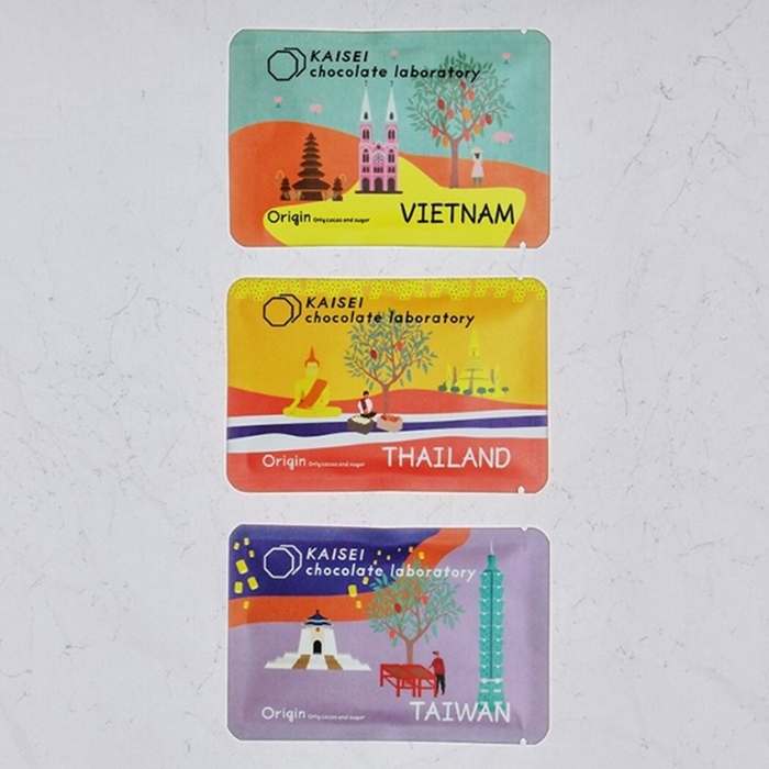 カカオの原産地ごとのパッケージになっており、ベトナム産カカオはフローラルな香り、タイ産のカカオは青リンゴのようなさわやかな酸味、台湾産のカカオは赤ワインのようなタンニン感をそれぞれ味わうことが可能です。