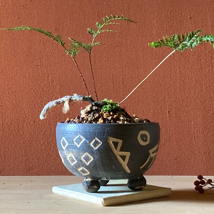 鹿児島出身。有田の窯元や異業種で働きながら作陶を続け、結婚を機に湘南へ。2017年に自分の窯を持ち、現在神奈川県大磯の自宅で作陶中。食器、植木鉢、カヤリ、アクセサリーなど、暮らしの中にあったら良いなと思うものを形にし、普段に使ってもらえるよう丈夫な作りを目指している。今回の展示の見どころは新作「seino blue」。白い土に青い顔料を混ぜて色々な青い土を作り、数種類の土を重ねて捏ねてロクロで挽いて成形。さまざまな青から成る表情豊かなうつわを楽しめる。電子レンジ、食洗機は使用可。オーブン不可。