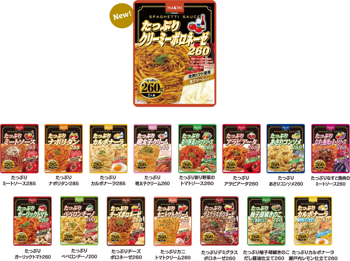 ハチ食品の『たっぷりパスタ』は、1袋で2~3人前のボリューム満点でたっぷり大容量なパスタソースです。今回、生クリームを使用したクリーミーで旨みたっぷりのボロネーゼソース「たっぷりクリーミーボロネーゼ260」が新登場します。