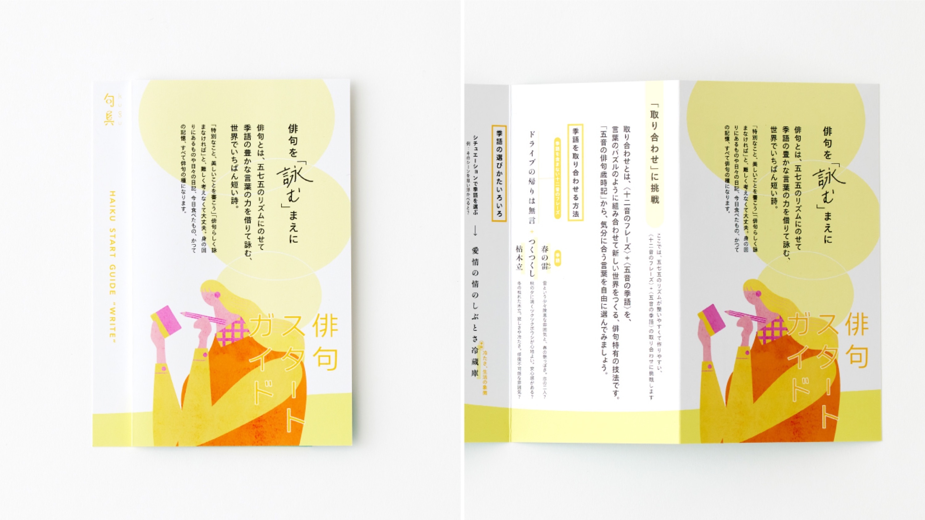 そんな、俳句の「詠む」「読む」それぞれのあそびかたのコツをコンパクトにまとめたのが、この蛇腹スタイルのリーフレット「俳句スタートガイド」です。おもてに「詠む」、うらに「読む」についてガイドしています。どちらも俳人の神野紗希先生の監修です。