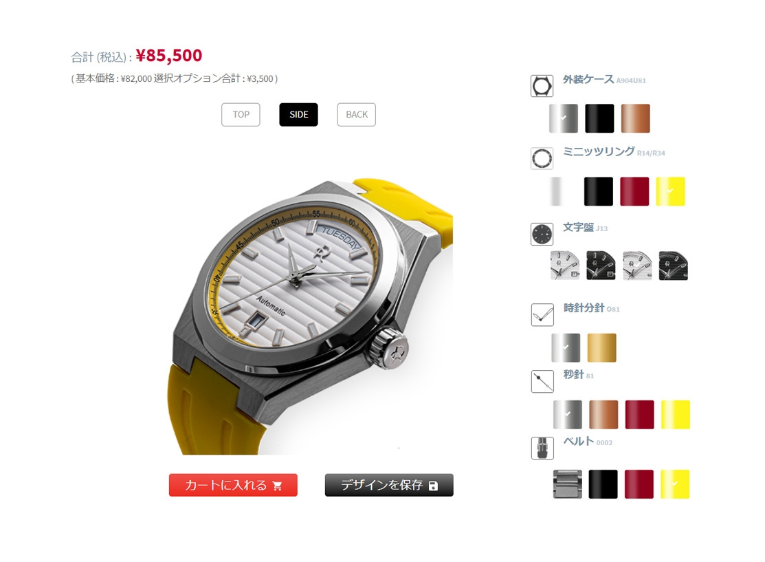 腕時計の各パーツを、シミュレーションサイトで、自在にカスタマイズしオーダーすることができます。シミュレーションサイトではパーツを選択することで完成品のイメージが画像で表示されるため視覚的に楽しむことができます。