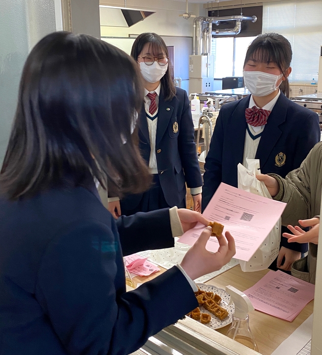完成した親芋ワッフルは、2月下旬に校内で販売され、約370枚が完売。購入した生徒や関係者からは、「もっちり食感で美味しかった」「本来捨てられる親芋を、こんなに美味しく食べることができて驚いた」「学校の食堂などで販売してほしい」などのコメントが寄せられました。また、参加した生徒たちからは、「試作では調理のしづらさなど思い通りにいかない面も多く、もったいないから使おうという気持ちだけでは実現できないことがわかった」「親芋ワッフルをきっかけに、廃棄食材について考えてもらえると嬉しい」「試作や研究を重ねる中で、農家さんや企業の方々の苦労も同時に学んだ」「食品メーカーで働くことになったら、この経験を生かしたい」といった声が聞かれました。