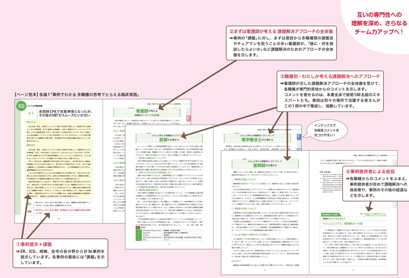 ■ 各論1「事例でわかる 多職種の思考でとらえる臨床実践」(p.25~266)では、ER、ICU、病棟、在宅の各分野からチームアプローチが必要な事例を取り上げ、その事例ごとに課題に対して、各職種の臨床家がチームアプローチの視点に立った見解を示します(下図)。