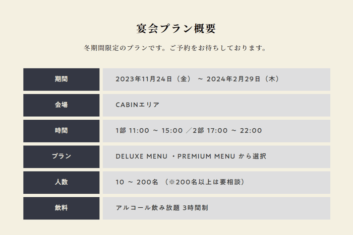忘年会の新定番!“リゾート”で忘年会を。期間限定で忘年会・新年会にぴったりな宴会プランの販売を開始:11月24日(金)~2月29日(木)【キラナガーデン豊洲】