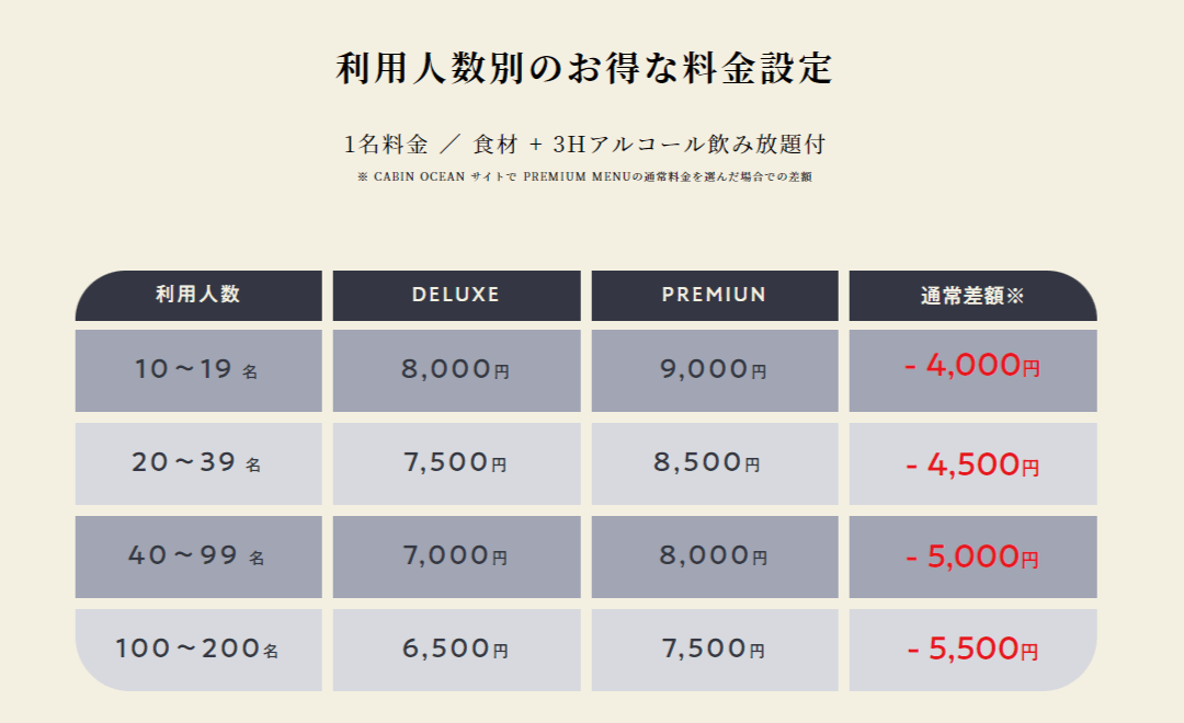 通常BBQメニューとアルコール飲み放題を利用人数に応じて特別価格でご利用いただけます。(6,500円(税込み)/名よりご利用可能。)