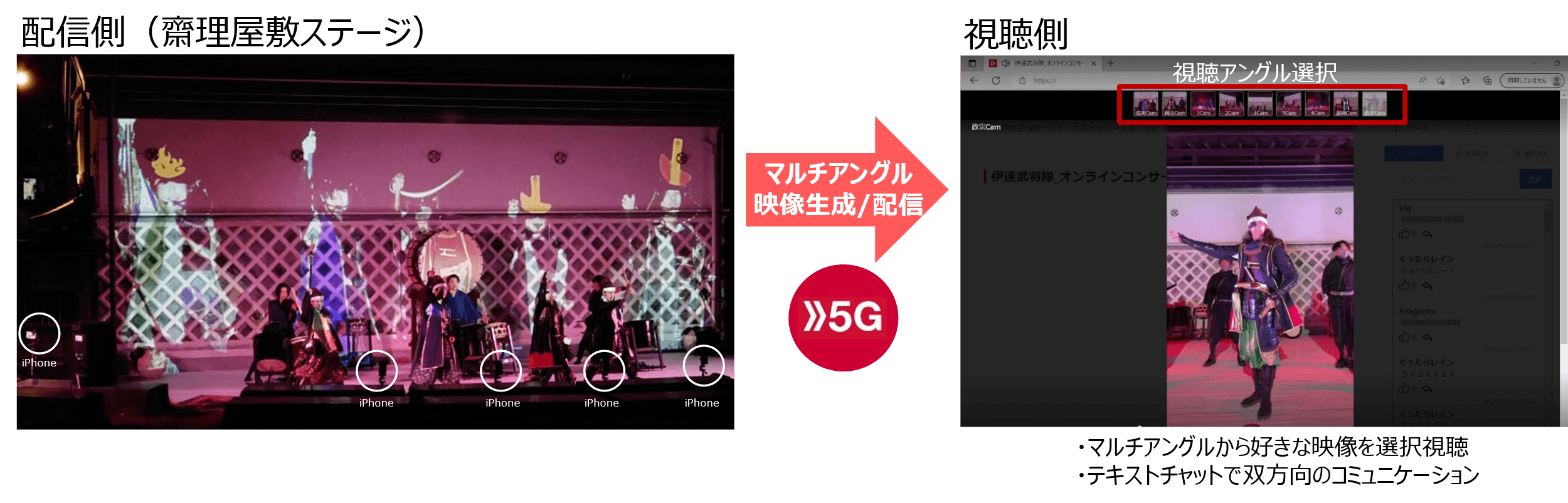 本実証は、宮城県伊具郡丸森町の「蔵の郷土館 齋理屋敷」で実施しました。複数台のiPhoneで、奥州・仙台おもてなし集団「伊達武将隊」の演武や、パフォーマンス集団「白A」の演出、宮城県丸森町太鼓集団の「旅太鼓」のパフォーマンスを撮影。撮影した映像は、遠隔にいる参加者が自身のPC等から好みの視点で見られるようにしました。映像生成、配信システムは、マルチアングル映像が体験できるSwipeVideoを利用し、ステージから配信システムへの音声映像送信に5Gを使用しました。