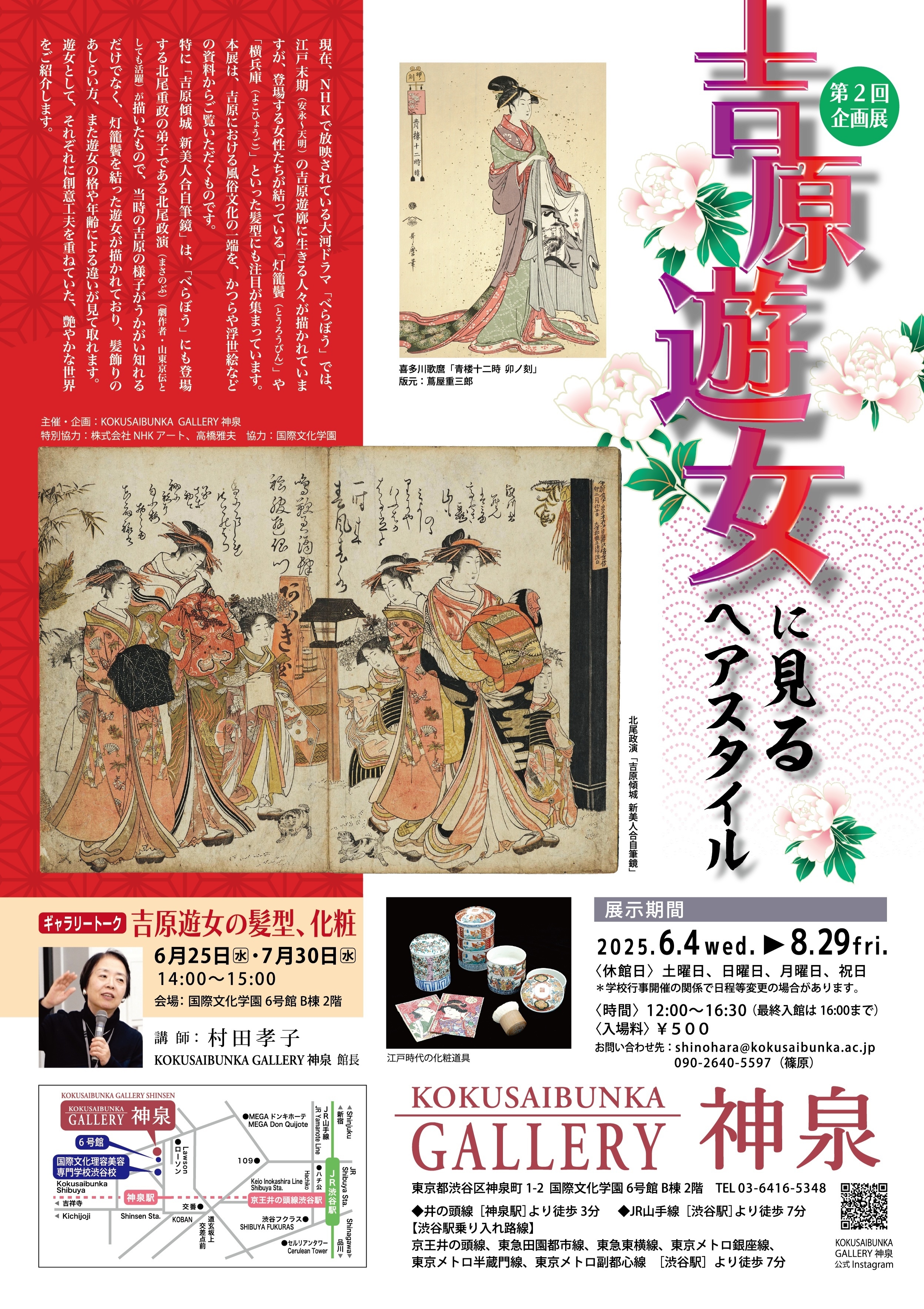 会期は2025年6月4日(水)~8月29日(金)まで。会期中の6月25日(水)、7月30日(水)は当ギャラリーの館長でもあり、日本美容風俗研究の専門家でもある村田孝子によるギャラリートークを開催、吉原遊女の髪型や化粧について解説いたします。併せてお楽しみください。