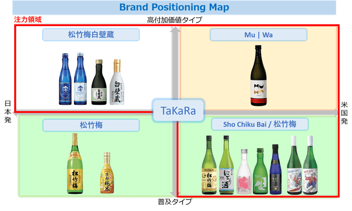 米国宝酒造では、日本発のスパークリング日本酒「澪」と「白壁蔵」の販売に注力するとともに、米国発の新たな商品開発に取り組んでいます。まず、米国産の高付加価値ブランドとして新発売した「MU|WA」の育成に注力します。そして、米国産の「Sho Chiku Bai」は、日本食レストランを中心とした顧客へのさらなる浸透を図りながら、米国の料理とマッチングした普及タイプの商品開発などに取り組み、イノベーティブなSAKEの領域を拡大していきます。