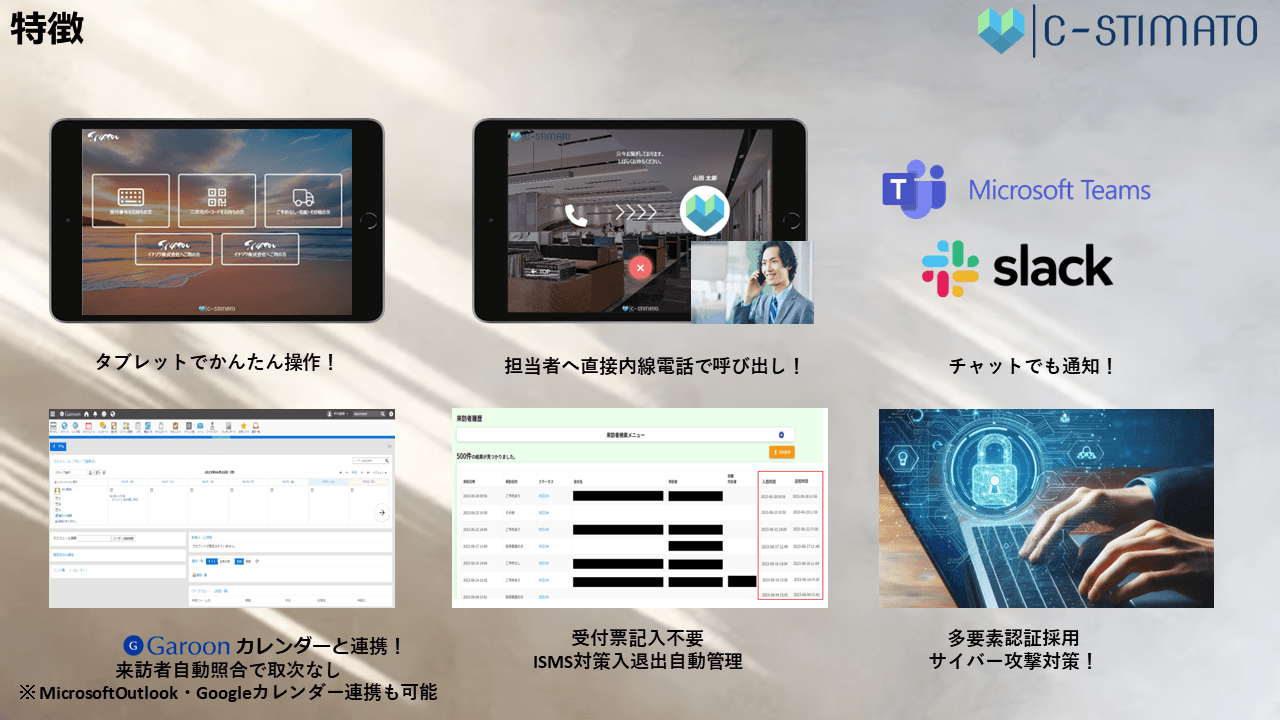 イナゾウは上記の課題に対する解決策として、「従業員情報が漏洩しない仕組み」と「内線通話+Microsoft Teams/Slackのダブル通知制」を備えた新しい受付システム「C-STIMATO」を発表。