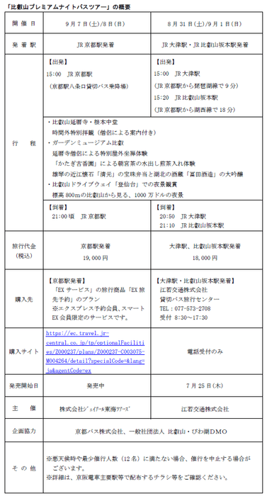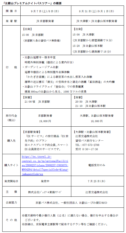 江若交通株式会社(本社:滋賀県大津市、代表取締役:安積正彦)と京都バス株式会社(本社:京都市右京区、代表取締役社長:吉本直樹)は、一般社団法人比叡山・びわ湖DMOの協力を得て、比叡山・滋賀の自然・歴史・食・文化を一日で味わうことのできる特別プラン「比叡山プレミアムナイトバスツアー ~比叡山・滋賀の自然・歴史・食・文化に触れる特別な一日~」を開催します。