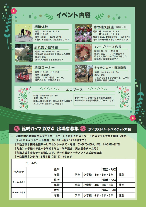 今年も篠崎公園にお相撲さんがやってきます!本物のお相撲さんと、一緒にお相撲をとってみませんか。その他にも、ちゃんこの無料配布、3×3ストリートバスケット大会開催、ふれあい動物園、冬の花の寄せ植え講座や、ハーブリース作りなどなど、イベント盛りだくさんです。