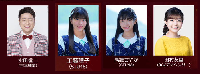 究極のお土産『王土産』の開発めざし各局がそれぞれ出演者と広島の人気店にオファー、番組を制作します。出演は瀬戸内を拠点に活動するアイドルグループ「STU48」を中心に、広島ゆかりのタレント・芸人・著名人など各局多彩な顔ぶれ。はたしてどんな新しい広島土産が誕生するのか?!