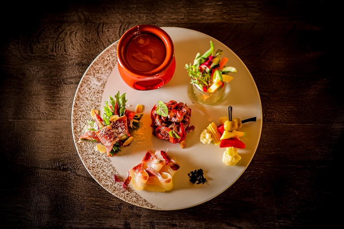 【フードメニュー】〈美食プレート〉水菜と生ハムのロール スライスアーモンド/鶏むね肉の酒粕マリネ/オリーブマリネとピクルスのピンチョス/カンパチのカルパッチョ 炭塩添え/彩り野菜のスティック ビーツのバーニャカウダ