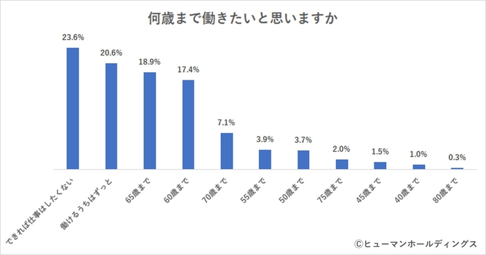 「何歳まで働きたいと思いますか」という質問をしたところ、「できれば仕事はしたくない(23.6%)」が1位である一方で、一般的な“定年”とされる「60歳まで(17.4%)」、「65歳まで(18.9%)」を押さえ、「働けるうちはずっと(20.6%)」が2位にランクイン。“人生100年時代”と言われる現代において、将来にわたり働く意向のある30代の姿が明らかになりました。