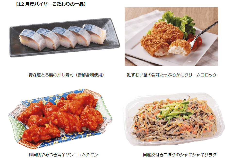 12月にラインアップする商品は、「青森産とろ鯖の押し寿司(赤酢舎利使用))」「紅ずわい蟹の旨味たっぷりかにクリームコロッケ」「韓国風やみつき旨辛ヤンニョムチキン」「国産皮付きごぼうのシャキシャキサラダ」の4品です。