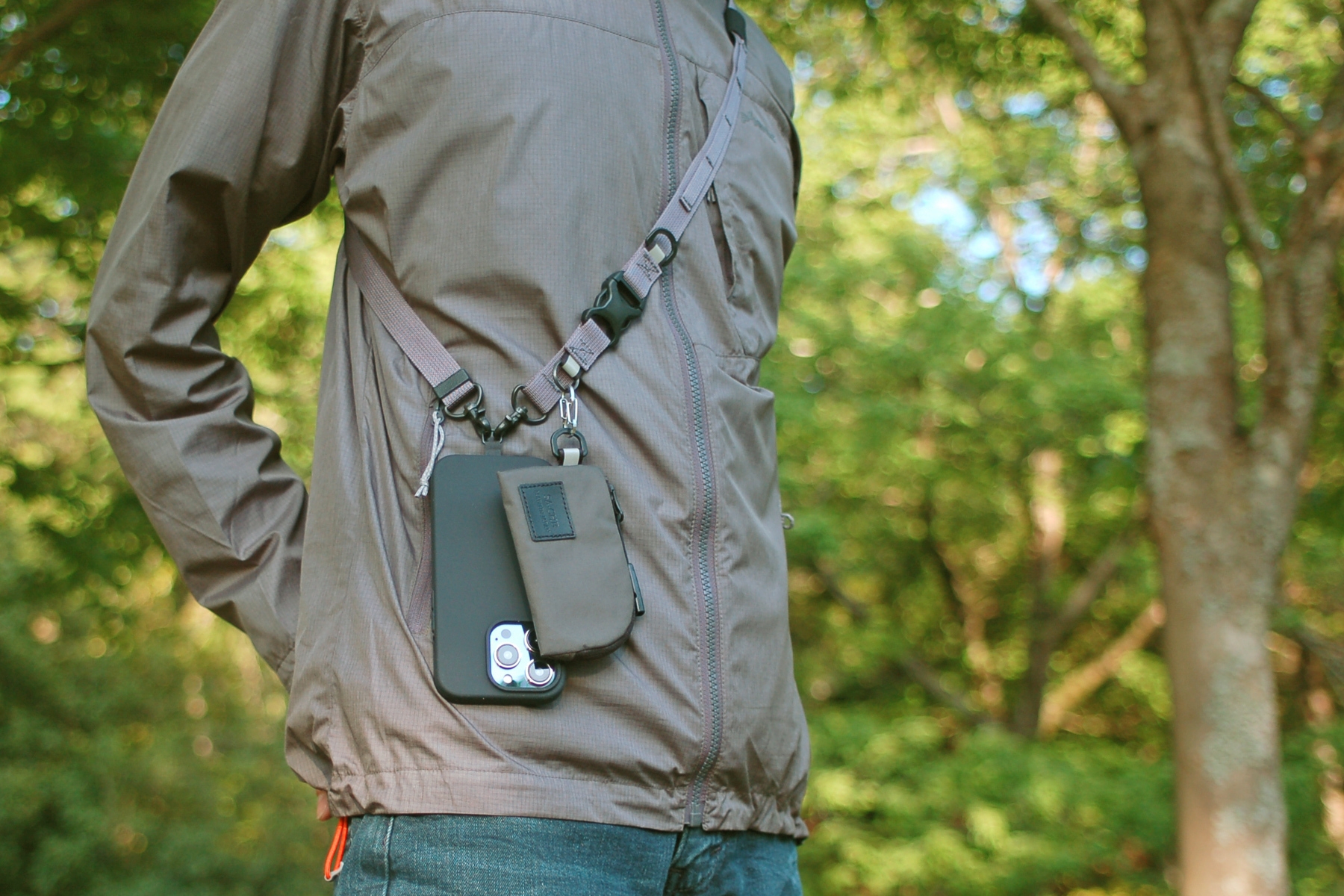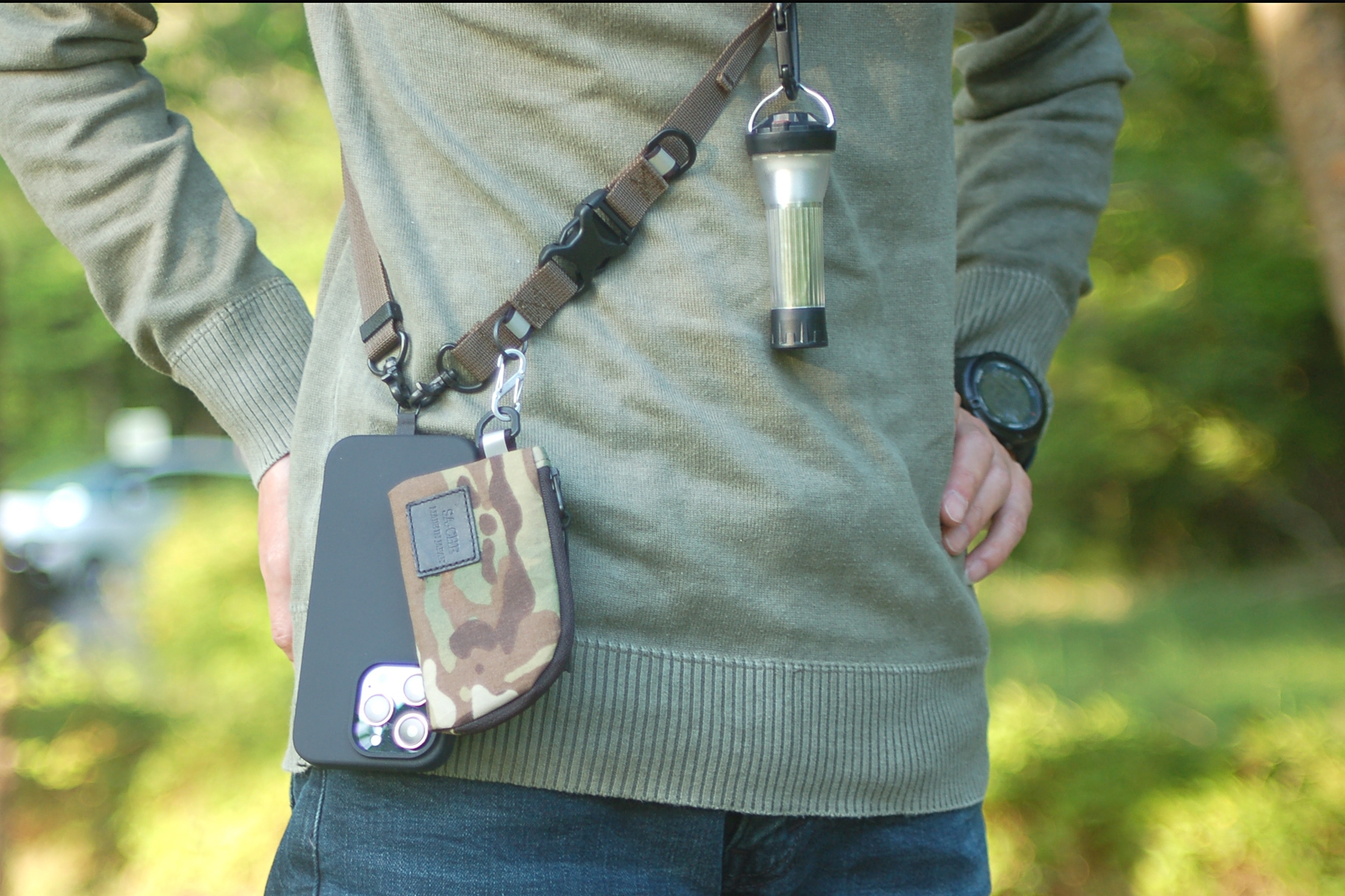 アウトドアシーン、キャンプ、スポーツ、アクティビティでスマホ、財布、サングラス、小物などを手ぶらで携帯するためのマルチストラップです。