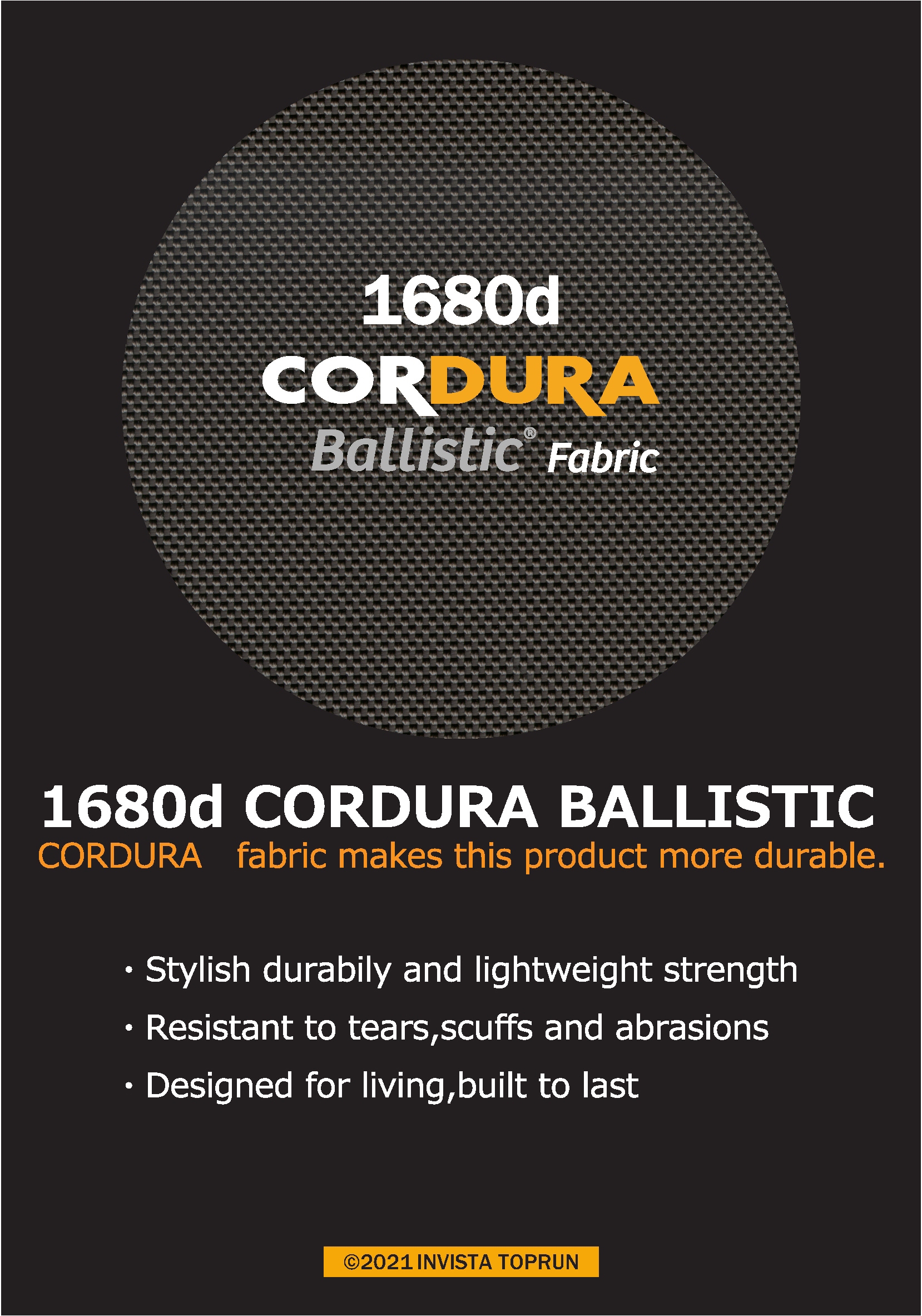 表面素材には、ナイロンの7倍もの強度を持つインビスタ社の強力糸 CORDURA(R)の【1680デニール】を2本撚りにした、バリスティック織生地を使用しています。