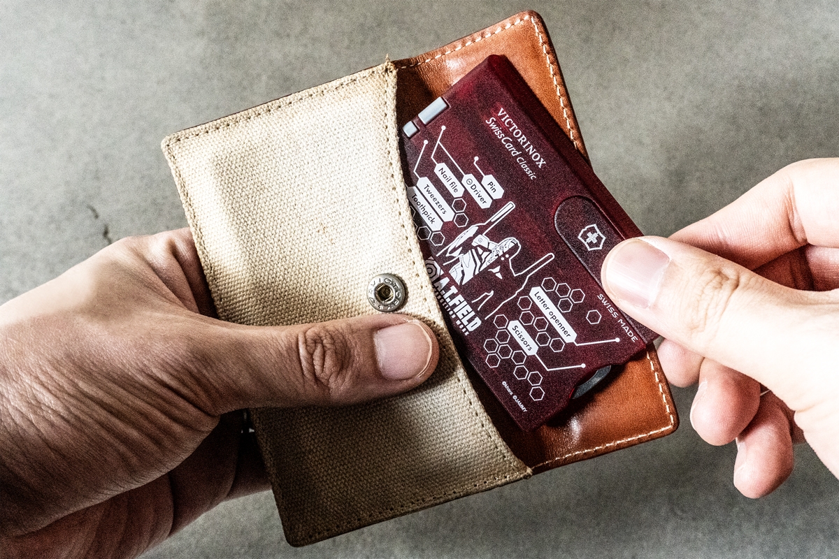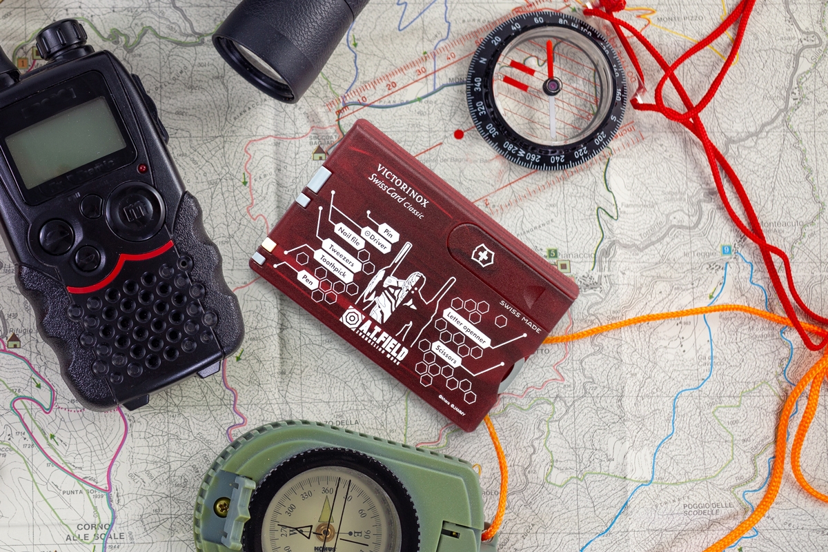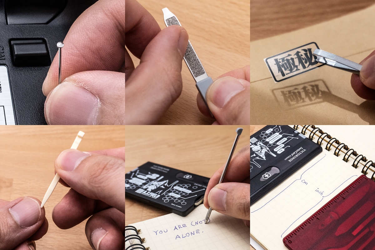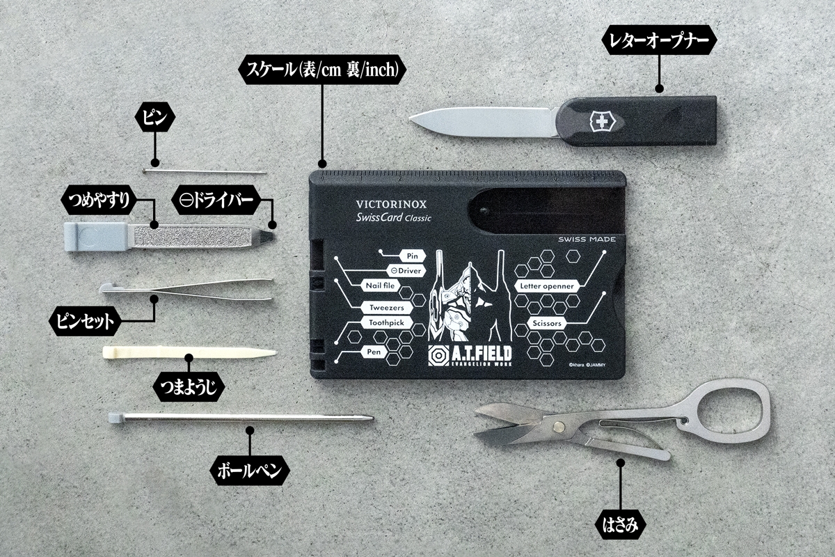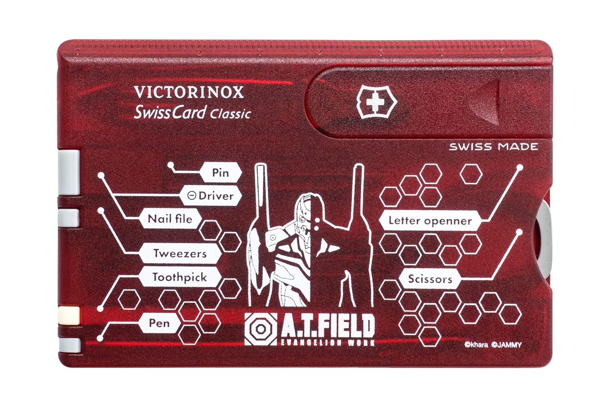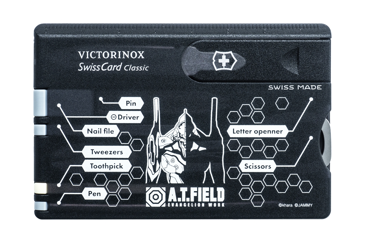 エヴァンゲリオンのワークブランド「A.T.FIELD EVANGELION WORK」と、1884年スイスでナイフメーカーとして創業しマルチツールをはじめとする高品質・高機能な商品を世界中で製造・販売し続ける「ビクトリノックス」の代表的な商品「スイスカード」がコラボレーションした、カード型マルチツールです。ちょっとした軽作業やケアに便利な10個のツールをスマートに携帯することが可能です。日常生活のほか、アウトドアシーンや旅行先などの様々な場所と場面で活躍するアイテムです。
