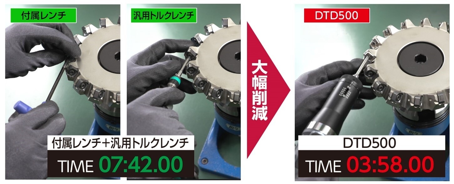 電動でネジのゆるめ・締付けを素早く行い、トルク値の確認は手動による増し締めで設定したトルク値に達します。クラッチが作動しインサートの交換、コーナーチェンジ作業を素早く正確に行えるため、作業時間を大幅に削減します。