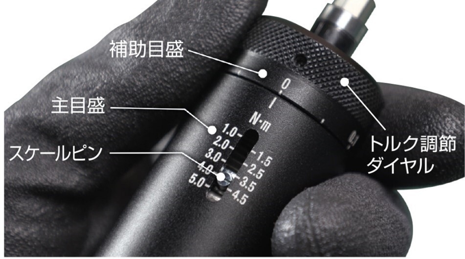 トルク値は、本体のトルク調節ダイヤルを回すと中央にある目盛りが動き、1~5N・mの間で任意の位置に簡単に合わせられ、設定したトルク値でクラッチが作動します。