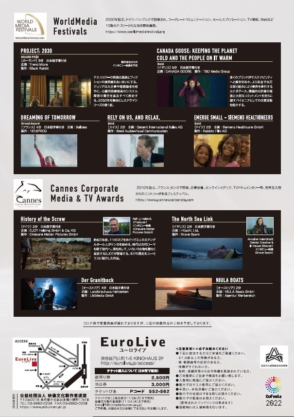 「映文連アワード2022受賞作品上映会」では、国内の最新企業映像・文化映像・映画など多様な受賞32作品を8つのプログラム(カテゴリー)に分けて上映。同時開催の「International Corporate Film Showing 2022」(略称:ICFS)では、海外の優れた企業映像だけでなく製作会社からのインタビュー映像も上映します。