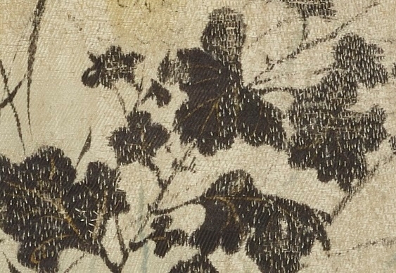 〈冬木小袖〉も経年による劣化が進み、汚れや糸の断裂が見られます。また、傷んだ表地を補強するために先の修理で施した並縫いの縫い目が目立っている状況です。