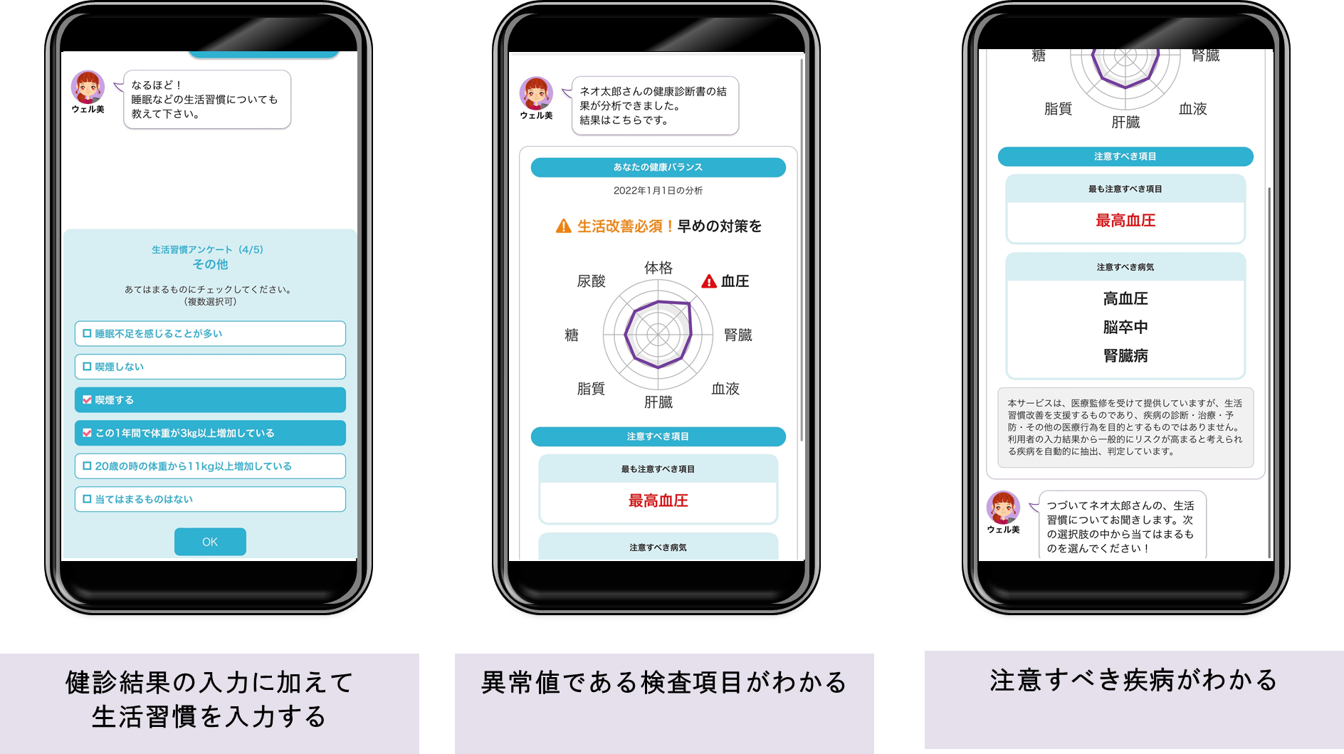 今般、本プロジェクト第1弾企画として、健診結果を改善したいが「何をしたらいいかわからない」「取組みがなかなか継続しない」等といった身近な悩みに着目し、一人ひとりのライフスタイルに合わせた生活習慣の改善取組みの提案やフィードバック等のサポートを行うアプリ「Neoコーチ」を開発しました。