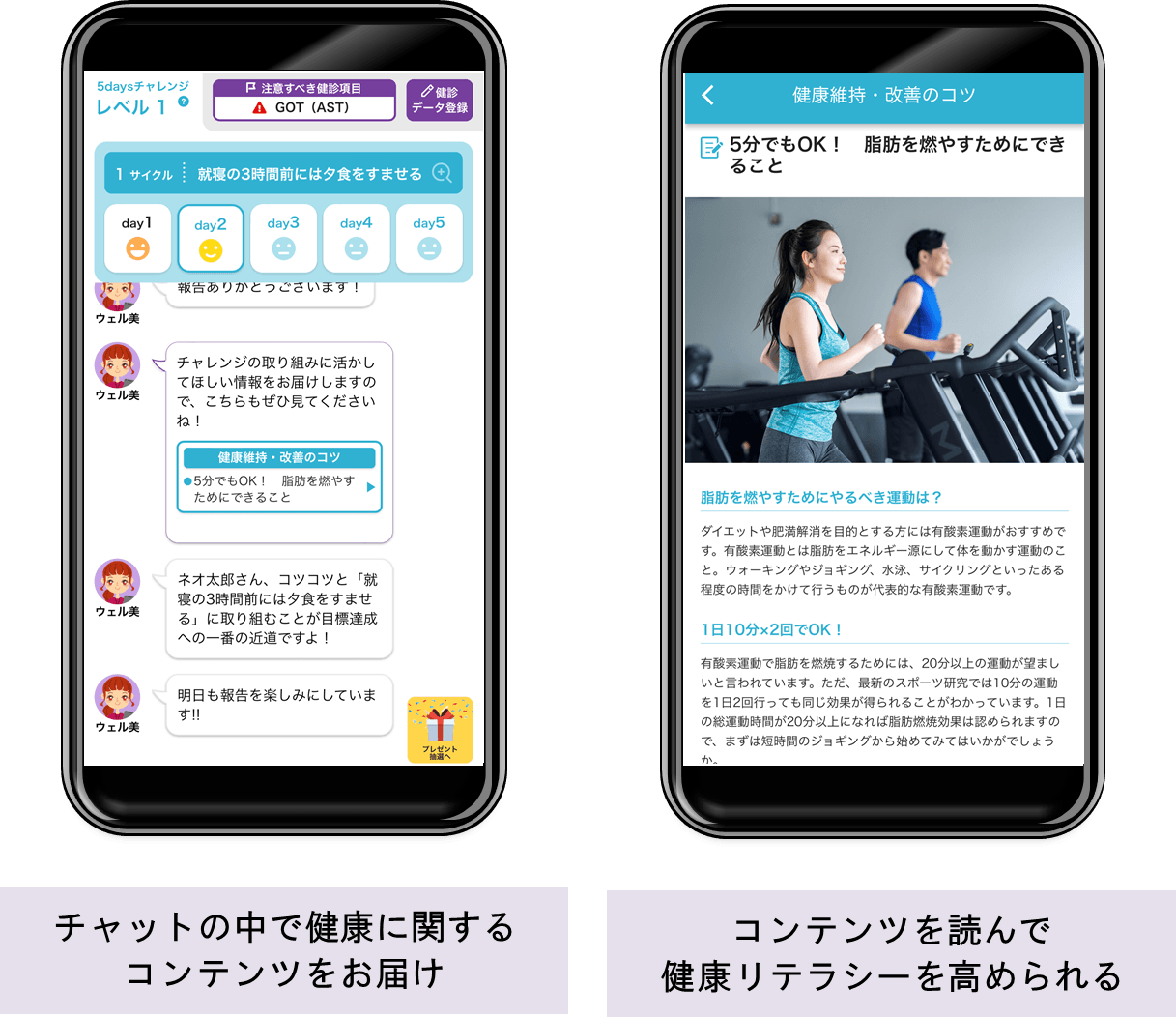 ・「健康リテラシー」を一気に習得することは困難です。そこで、本アプリは、予防医学・健康教育・ヘルスプロモーションが専門の福田洋医師や保健師の監修のもと、健康課題に合わせた「正しい知識&行動」のプロセスを繰り返すプログラムとすることで、少しずつ行動の定着、習慣化に導いていき、「健康リテラシー」を向上させる仕組みとしています。