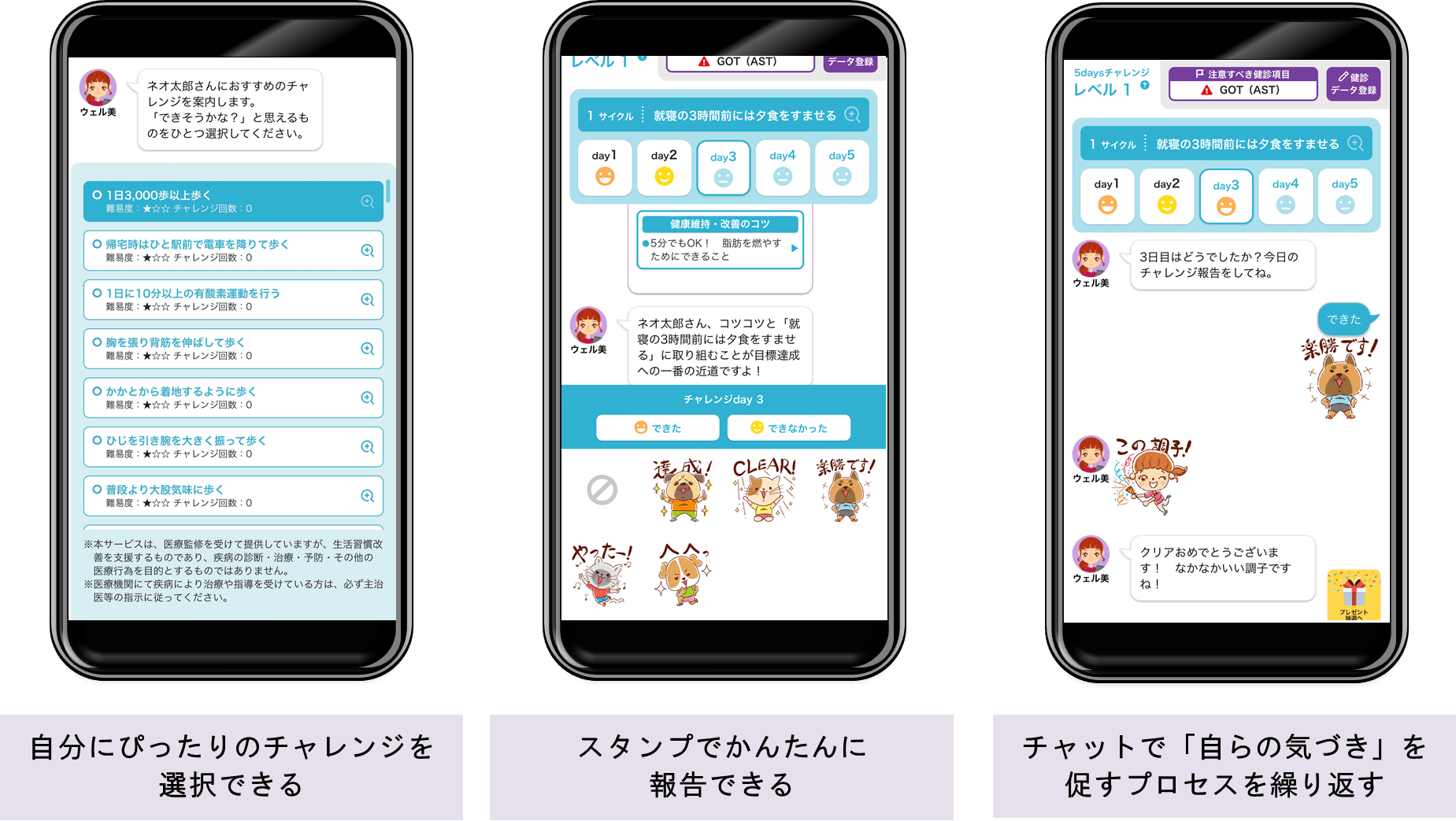 ・具体的には、ヘルスコーチ(ウェル美)から提案されたチャレンジ項目の中から自身が取り組みやすいチャレンジを一つ選び、5日間サイクルで取り組み、ヘルスコーチが日々のチェックと最終日の振り返りで「自らの気づき」を促すプロセスを繰り返します。