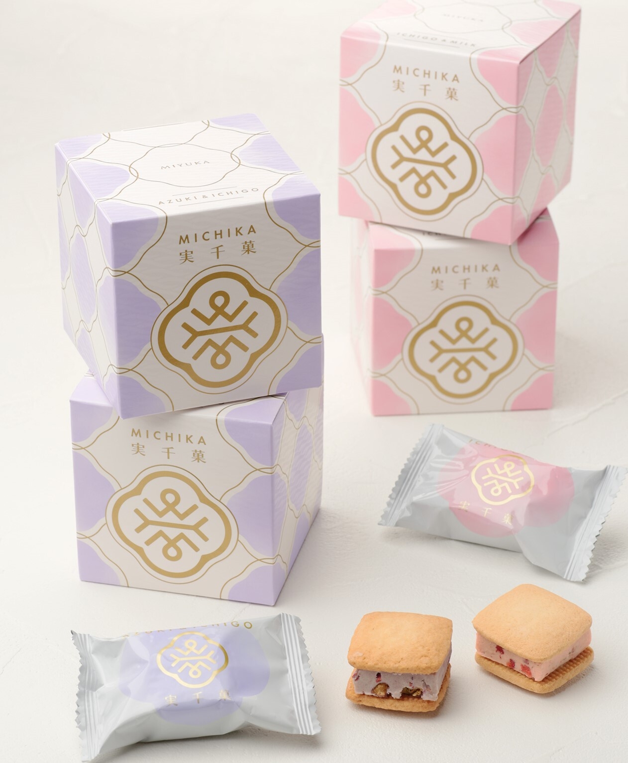 いちごをテーマにしたクッキーサンド「実千菓(みちか)」からは、「フレーバー別に購入したい」という声に応え、「あずき&いちご4個入」「いちご&ミルク4個入」を新たに発売します。