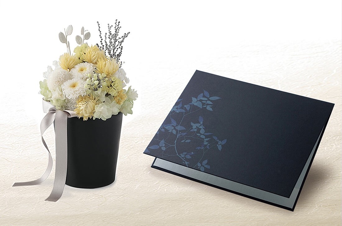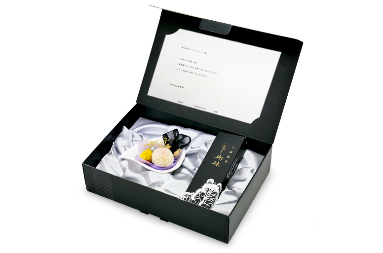 概要 :モノトーンの箱の内蓋にお悔やみのメッセージを付けて