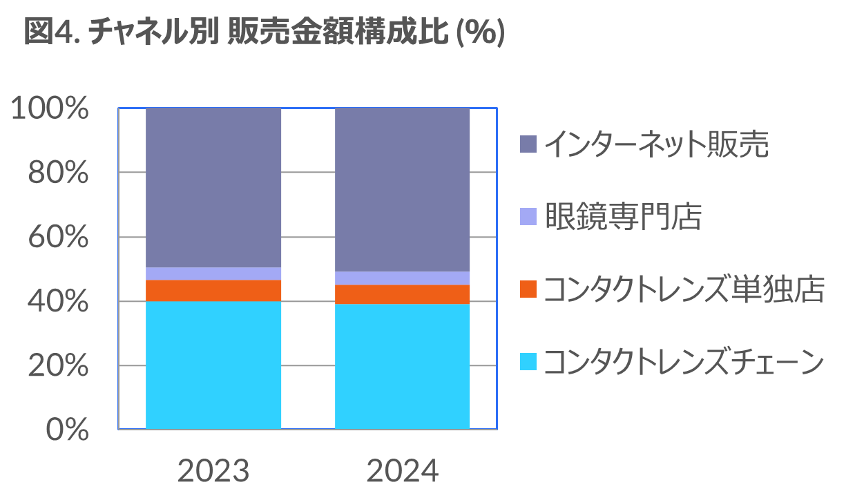 2024年におけるケア用品市場は金額前年比で8%減となった。コンタクトレンズチェーンでは10%減と大きく縮小した。また、主要チャネルであるインターネットでも5%減となり苦戦の要因となった。その結果、構成比はインターネットが伸長し、50%を上回った。(図4)。近年同様の傾向として販売店の意向やメーカー新製品が1日使い捨てレンズへシフトしており、コンタクトレンズ販売店においてケア用品の販売増加につながりにくくなっていると思われる。