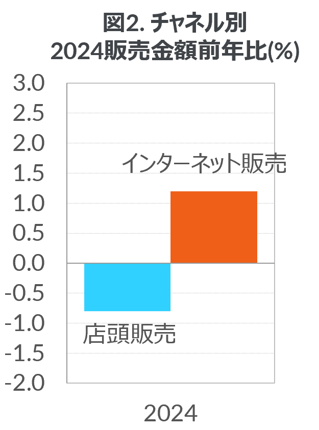 販売チャネル別で見ると、インターネットは金額前年比1%増となった(図2)。インターネットの成長は続いているが、2023年にその勢いが弱まり始め、2024年でさらに鈍化した。一方で店頭販売は金額前年比1%減と縮小する動きとなった。