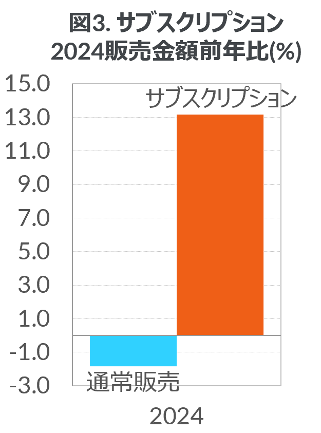 サブスクリプションサービスが好調に推移した。通常販売では2%減だったが、サブスクは金額前年比で13%増と二桁成長を記録した(図3)。ユーザーの囲い込みが見込めることから、メーカーだけでなくリテーラーも独自のサブスクリプションサービス提供に注力する動きがあり、またユーザーにとっては価格面でのメリットがあることから今後も成長を続けていくと考えられる。