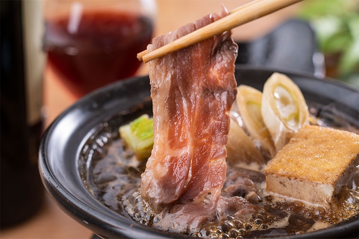 ご馳走メニューの代名詞、牛すき焼き。さぬき赤ワインを使用したコク深い割り下と一緒にお楽しみください。