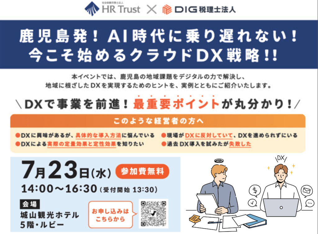 社会保険労務士法人HR Trustの創業25周年を記念して開催される大規模DXセミナー「鹿児島発!AI時代に乗り遅れない!今こそ始めるクラウドDX戦略!!」にみらいコンサルティンググループも出展。本セミナーはご好評をいただき、お申し込みは満員となっています。
