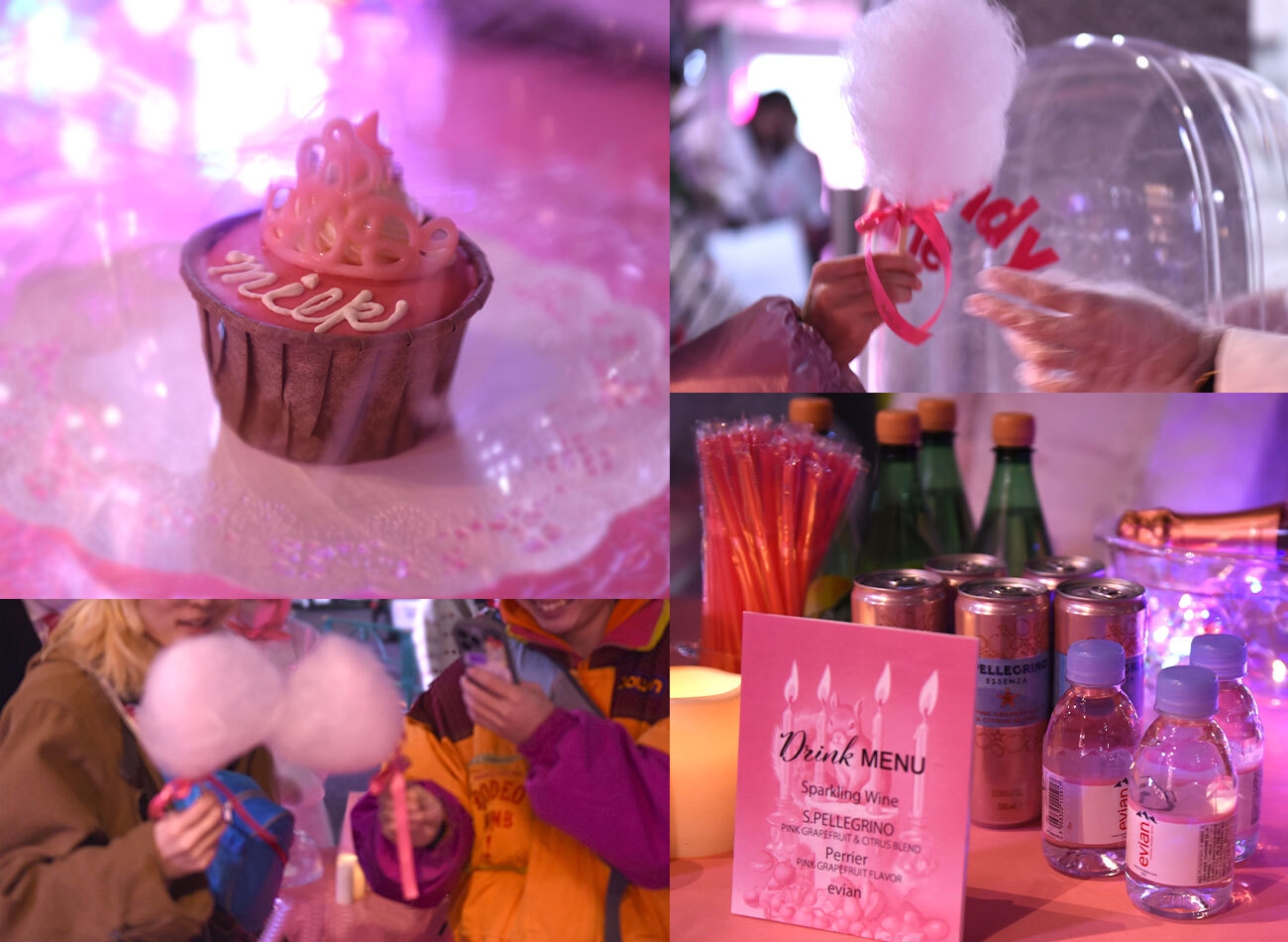 ピンクのコットンキャンディーやドリンク、おみやげには原宿スイーツのコロンバン(colombin)のピンクのティアラが乗ったキュートなオリジナルカップケーキもプレゼント。