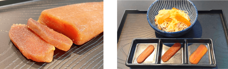 これまで期間限定で営業していた直売スペースを通年オープンとし、オススメの食べ方をおしゃれなカウンターで提供する「本からすみ茶屋」(営業時間:9時~17時、火曜・木曜日が定休)を2025年4月28日にオープンしました。兵庫県・宮崎県・三重県産の「産地別からすみ食べ比べセット」(税込500円)。粉末からすみをふりかけた「からすみそうめん」(税込500円)。7月からは「本からすみ+酒粕からすみ」セット(税込550円)や「からすみ餅」(税込1,000円)などをご提供します。
