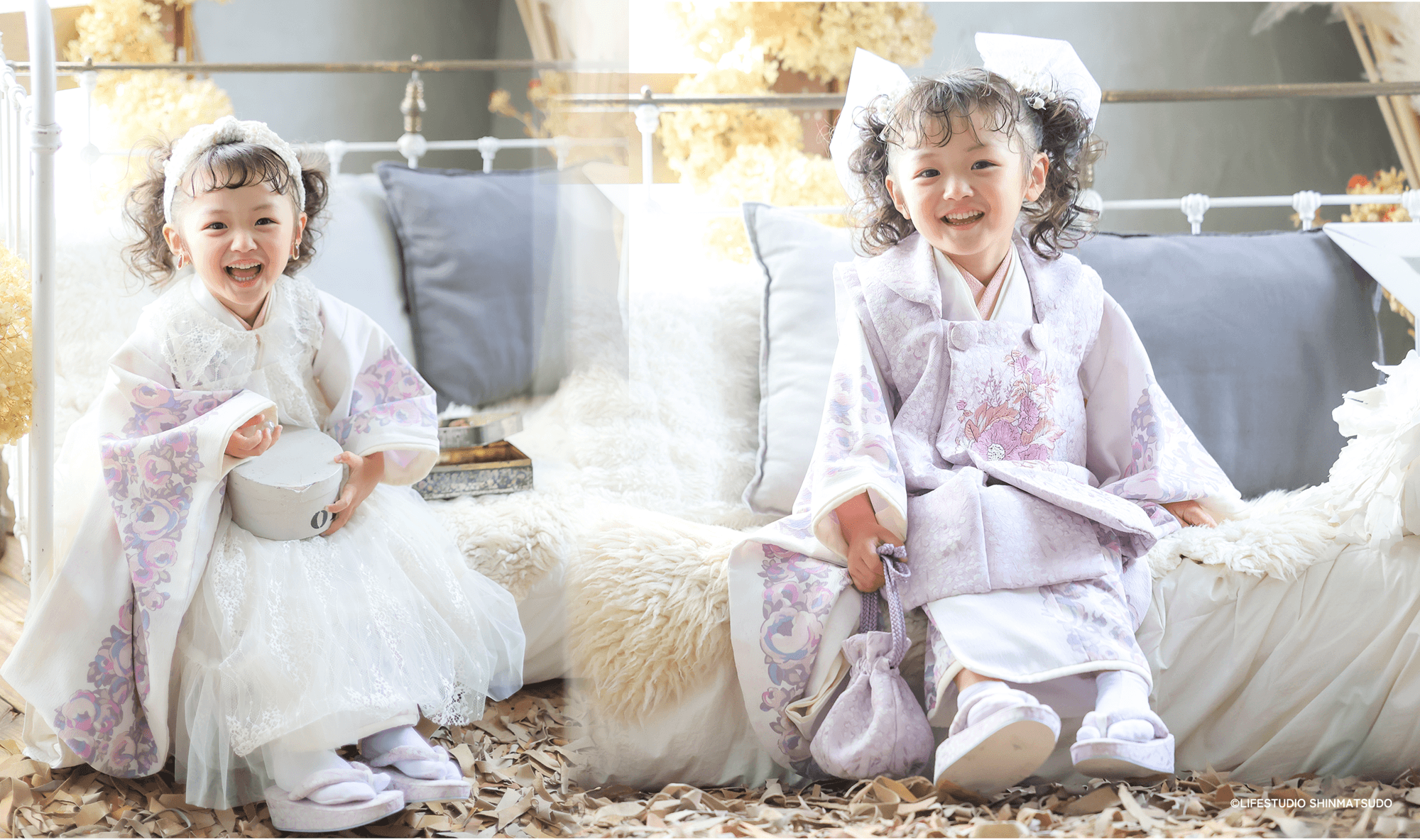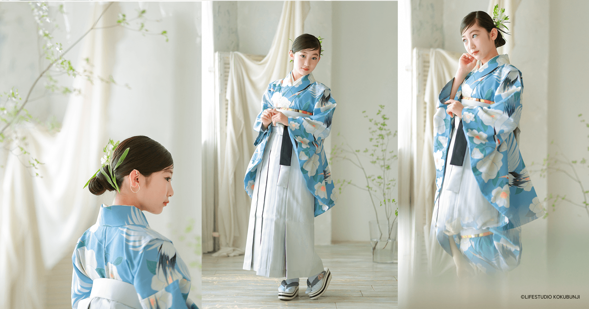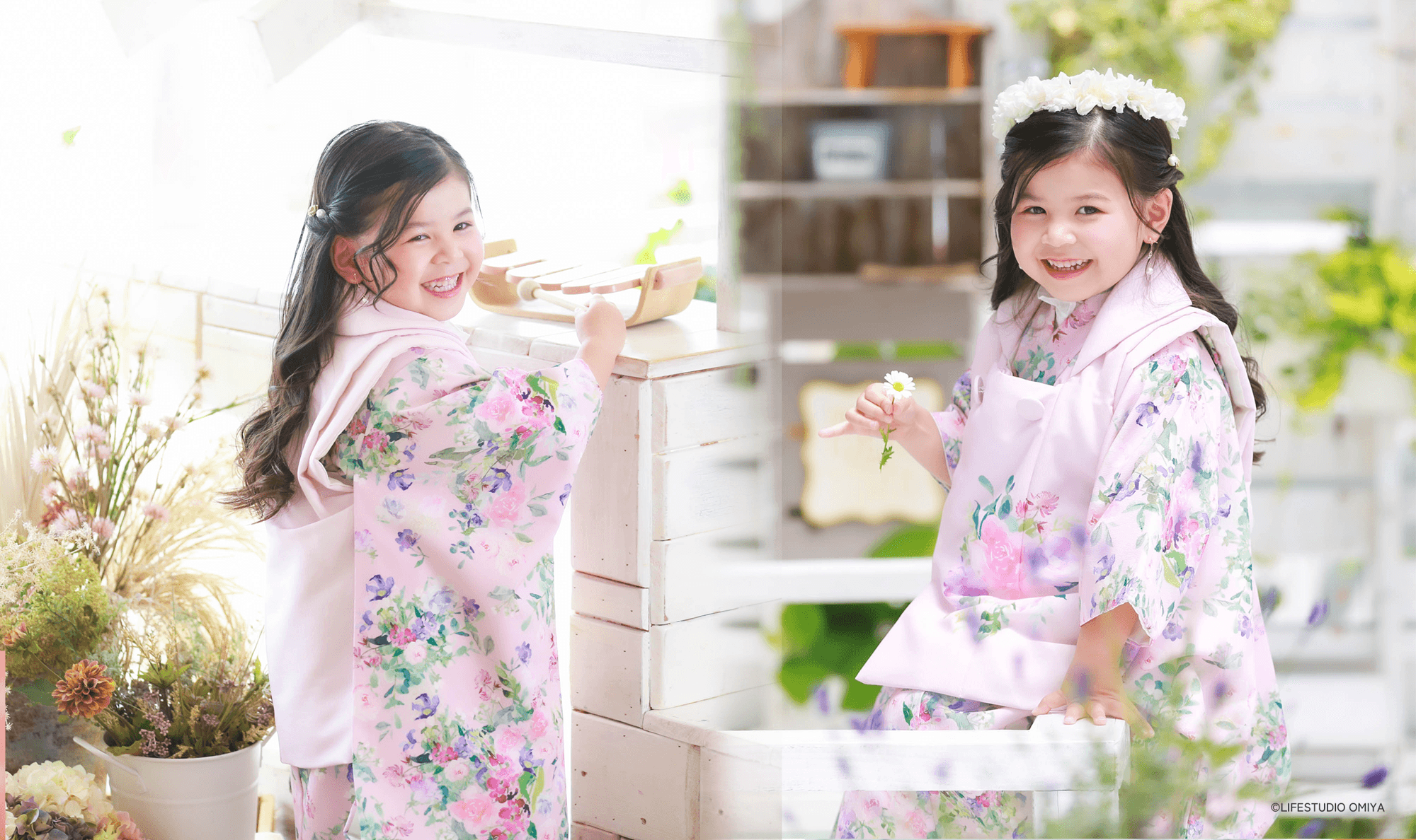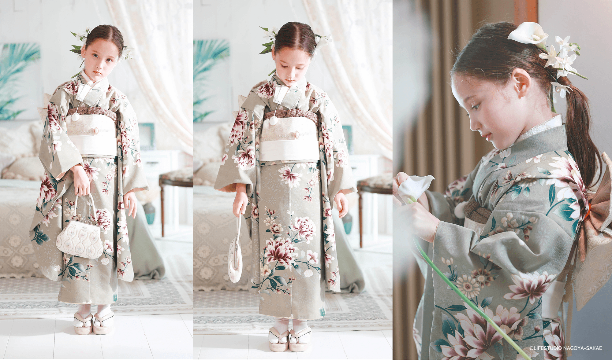 ライフスタジオの七五三撮影ではがちがちに固めた日本髪ではなく、日本髪風のアレンジを施すので、七五三の着物を着ての撮影が終わって洋装やカジュアル衣装の撮影でも、すぐにほどいて他のアレンジがしやすくなっています。