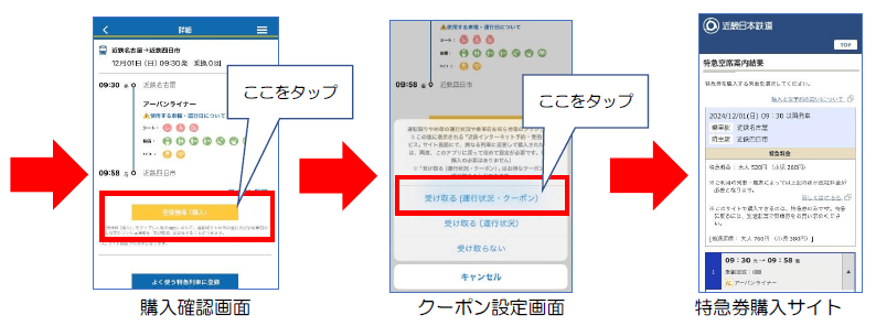 (1) 期間中に近鉄アプリの「特急空席検索・購入(運行情報・クーポンあり)」から対象列車を選択時に表示される「受け取る(運行情報・クーポン)」を選択してインターネット予約・発売サービスWEB サイトで特急券を購入